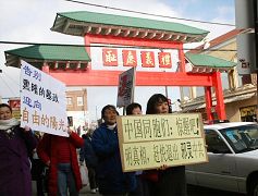 集会之后,与会人士举着横幅和标语在南华埠的大街上游行,迎面走来一名男子和推着婴儿车的女子。退党义工刚要走上去递上退党传单,那名男子就对着她竖起大拇指,笑着用广东口音的普通话说:“搞定了!我已经退了。”