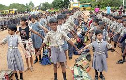 随即,校长吩咐老师用麦克风广播,请学校小学生先行出来集合炼功,因为学校操场一下子没法容纳太多学生,只好分三批。校长便带我们到操场,工友及老师合力搬两张桌子,分开摆放,由台湾学员余女士及Chitra做示范,并请Chitra边做示范、边讲解。