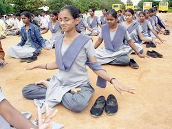 学生看着Chitra讲解及台湾同修的动作,集体炼功。动作方面有些很标准,有些则很不一致,第五套功法中,有些做的很好,双盘很标准,有些怕痛盘上又放下来 。学生很可爱,尤其那一年级的小朋友纯真的模样,真是讨人喜欢。