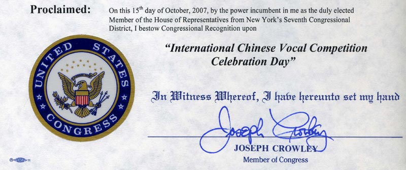 美国纽约州国会议员约瑟夫•克劳力宣布二零零七年十月十五日为全世界华人声乐大赛日