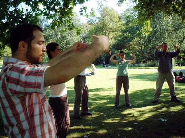 ![]() 法轮功学员在摄政公园炼功、发正念。在炼功的人群中,包括当场跟学员们认真学起功法来的路人。 |