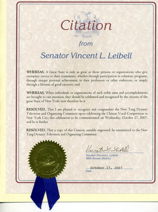 鉴此,我高兴的嘉奖并祝贺新唐人电视台在纽约市举办华人声乐大赛;并将在二零零七年十月十七日星期三予以庆祝。