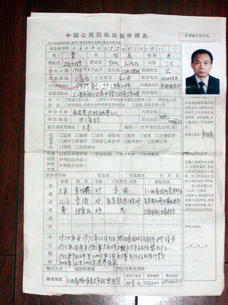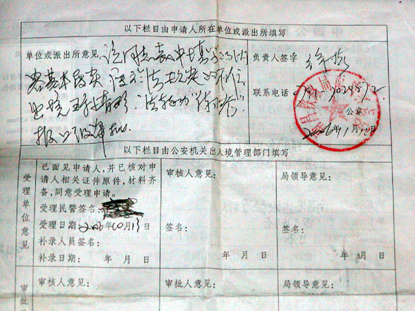2006年10月,章有亮夫妇在海外的子女因为工作繁忙,担心没有时间照顾小孩,非常希望章有亮夫妇能过去帮忙照顾。于是章有亮夫妇第三次去办理护照。这次,章有亮夫妇填好申请表,派出所和章有亮的工作单位都分别在他们的申请表上盖了章,签了字,并写明了他们的申请被拒绝是因为他们是法轮功修炼者。下面是两人在2006年申请护照时,被拒绝签发护照的护照申请表及拒绝理由。