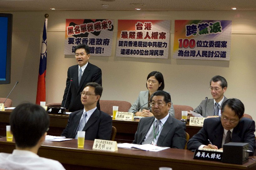 针对这项台湾人民权益遭到严重侵害的事件,立法院罕见的由国民党、民进党、台联、亲民党等一百一十三立委跨越党派共同提案联署谴责港府。