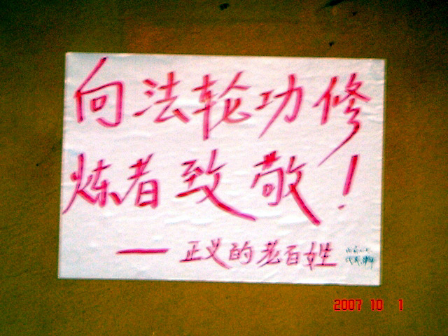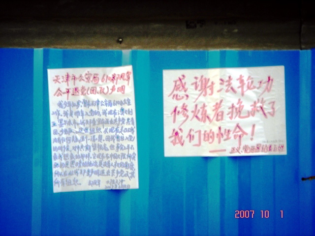 笔者现场用数码相机拍照时看到:“人们认真在观看真相标语,在一公园众多晨练的人们看完公园凉亭上的‘警察声明’后,谁都没有破坏,保持完好无损!”