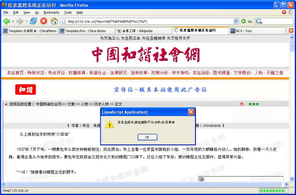 有一家陕西西安的网站叫“中国和谐社会网”,看起来不过是体制内的一些御用墨客为了迎合中共的“和谐社会”口号而建立的,并没有什么敏感内容。我点击了一篇有关历史人物的文章,内容刚显示出来,突然跳出一个对话框,称“信息监测系统监测到不允许的词 反革命”。