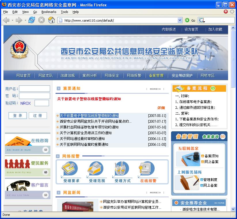按了一下“西安网监”,就来到了西安公安局下属的网络安全监察支队的网站。这个支队应该是1998年公安部正式成立的“公共信息网络安全监察局”遍及全国各个公安系统的一个了。