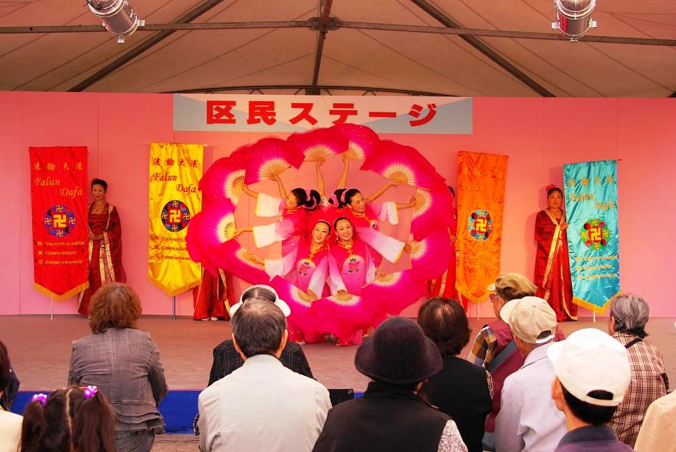 法轮功学员于下午二点在主会场登场,首先竖起了十六面法轮大法的旗帜,向观众介绍了法轮功学员通过舞蹈表现修炼者对真善忍的领悟和致力于传播真正中国传统文化的主旨。学员们为市民表演和解说了法轮功功法,还表演了喜庆亮丽的传统舞蹈扇子舞、威风凛凛的太鼓、宁静优雅的古典舞蹈花仙以及慈悲祥和而又庄严肃穆的古典舞蹈千手佛。学员们精彩优美而充满慈悲的表演,受到市民和区长区议员的热烈掌声喝彩。