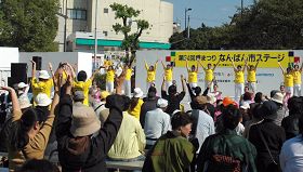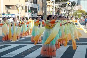 这天,秋高气爽,一百多名法轮功学员参加了「界市节」的舞台表演和市民大游行。他们在舞台上表演了舞蹈“花仙”、合唱“法轮大法好”、马头琴独奏和功法演示等。在演示法轮功功法时,现场很多人也跟着学起动作来了。