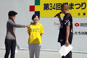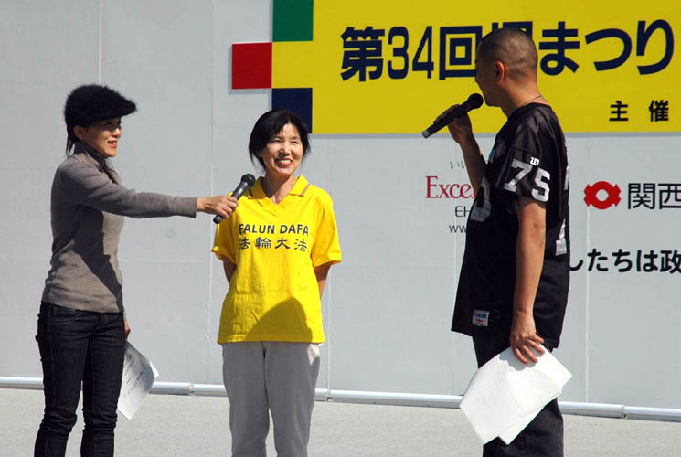 ![]() 舞台表演结束后,电台主持人采访法轮功学员代表 |