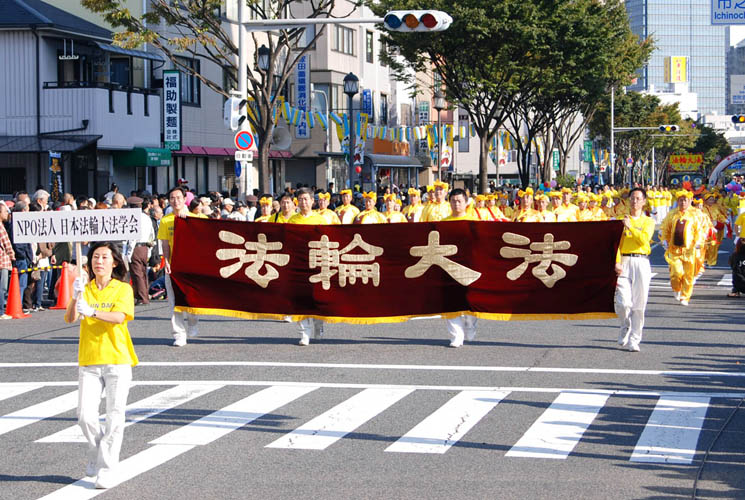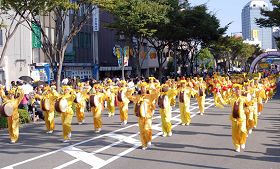 在大游行中,法轮功的游行队伍以腰鼓阵打头,接着是炼功方阵、花车和仙女队。法轮功学员的出色表演赢得了观众们的热烈掌声,不时还能听到“加油!加油!”的喊声。