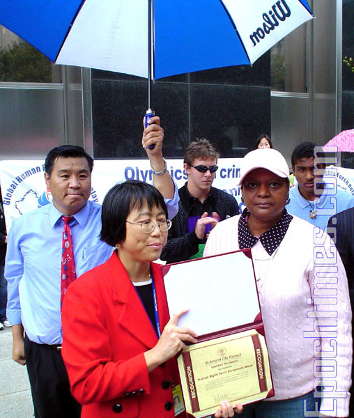 维吉尼亚州瑞曲曼(Richmond)市议会副主席麦克奎恩女士(右)代表瑞曲曼市议会颁发褒奖状给美东中区人权圣火全球传递(HRTR)及法轮功受迫害联合真相调查团(CIPFG)