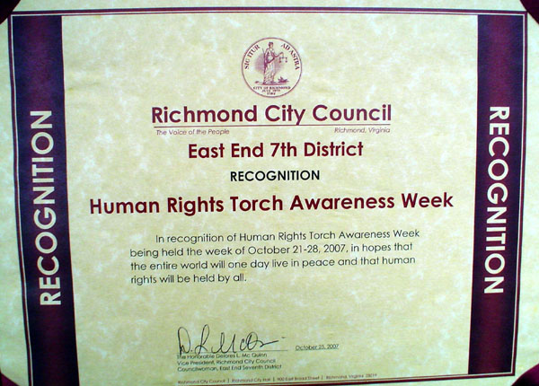 维吉尼亚州瑞曲曼(Richmond)市议会颁发给美东中区人权圣火全球传递(HRTR)及法轮功受迫害联合真相调查团(CIPFG)的褒奖奖状。