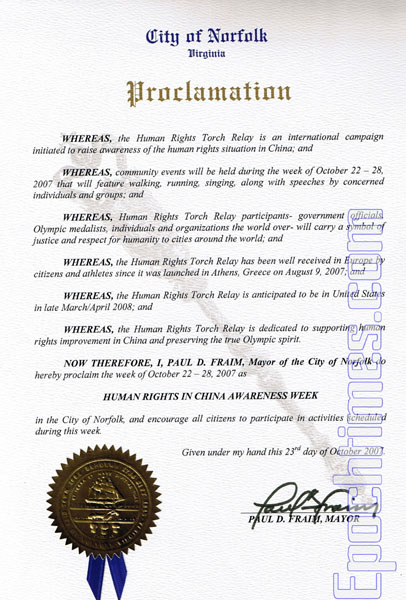 维吉尼亚州诺佛克市(Norfolk)保罗•佛莱莫(Paul D. Fraim)市长给“全球人权圣火传递”的褒奖奖状