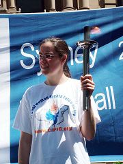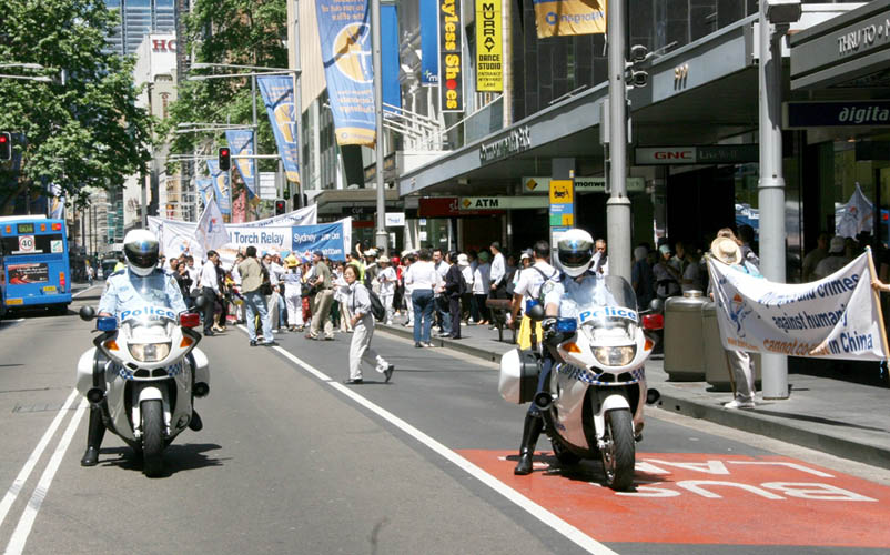 第一位圣火传递大使是绿党参议员凯瑞•纳什,她从萨瓦•欧司岛斯基博士的手中接过了火炬。人们开始形成一个火炬接力的长龙,沿着悉尼的乔治街,向悉尼的第二站环形码头前行。来自新西兰的全国维权抗暴连线的海外发言人潘晴从凯瑞•纳什手中接过火炬。