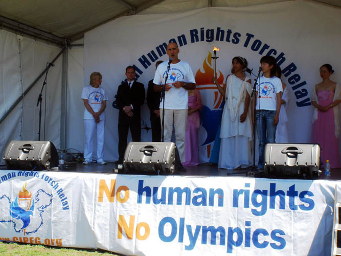 欧司岛斯基博士在欢迎仪式上发言,表示这是历史性的时刻,我们正在创造一个新的文化,这是历史上的第一次人权圣火接力。中国希望通过举办二零零八年奥运会取得经济成果,取得世界超强的地位,就象一九三六年希特勒利用柏林奥运来展示所谓德国经济、德国在世界上领导地位。今天这个人权圣火提醒我们和整个世界,奥运不只是给主办国获取政治和经济成功的机会,多年以来,奥运都是和人权、文明、和平联系在一起的。
