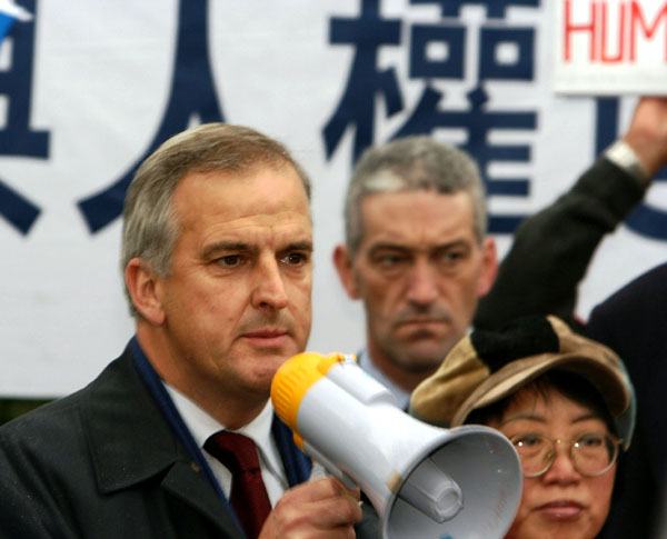 ![]() 欧洲议会议员罗勃特•埃文斯在人权圣火传递仪式现场发言 |