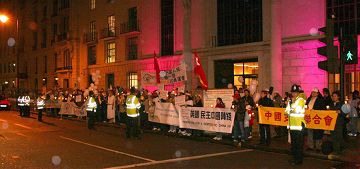 火炬交接仪式结束后,逾百人的队伍在警察的开路下,在人权圣火火炬的引领下,穿过伦敦市中心的主要街道,经过伦敦最繁华地段,来到中共大使馆前,在那里举行了烛光守夜。