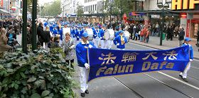 法轮功的游行队伍由欧洲天国乐团开道,包括“真善忍”横幅、揭露中共活体摘取法轮功学员器官的图片、介绍《九评共产党》和退出中共大潮、仙女队和腰鼓队等队形,在杜塞尔多夫最繁华的大街上举行了为时三个半小时的游行和集会。所到之处,人们无不驻足观看,不少人为天国乐团鼓掌叫好。很多人接到了传单,了解法轮功被迫害的真相,非常震惊。不少人签名制止中共迫害法轮功。