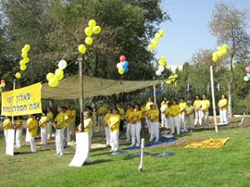 ![]() 游行开始前法轮功学员在公园里表演功法 |