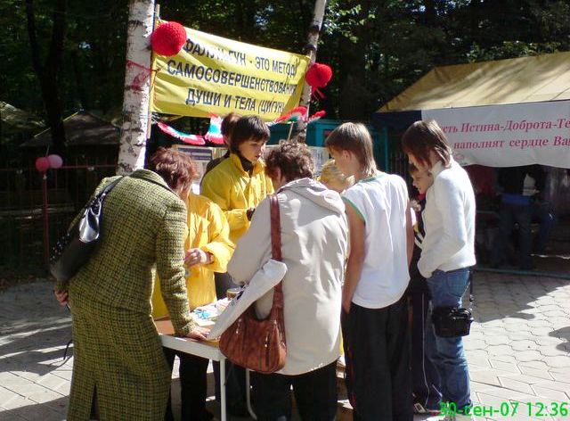 【明慧网二零零七年十月五日】二零零七年九月三十日是俄罗斯斯塔夫罗坡利市(Stavropoly)建城二百三十周年纪念日,二十九日和三十日该市举行了一系列庆祝活动,法轮功学员连续两天参加了在波别特公园(Pobed)的庆祝活动。