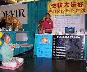 连日来在人流不断的博览会期间,法轮功展台不断吸引有缘人,好几个人告诉学员自己在炼功并看书。尽管从媒体等方面早已有所了解,但当亲眼看到法轮功时,很多人还是难掩兴奋,驻足长谈。旁边展台的女孩告诉学员,她自己炼过法轮功,还看过书。一位西人长者想要参加集体炼功,他自己一直在炼,感觉很好但苦于不能跟上中文的炼功音乐带。从旧金山来的Dean Mello几次过来交谈,并和学员一起做功法展示。他从网上下载了大法资料,已自学一年多了,感觉受益匪浅。另一位女士和学员分享了她天目看到的殊胜景象,在得知每星期天上午当地的炼功点后,她说:“我会去的,那将是我的‘教会’!”