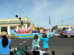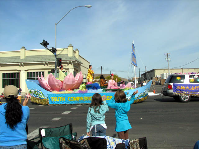亚基马市位于华盛顿州的中部,人口约八万,整个亚基马地区人口约二十三万。这里产的苹果世界闻名。法轮功学员今年是第一次参加该游行。美丽的“法船”花车,花车上盛装的“仙女”,穿着金灿灿炼功服的学员表演法轮功功法,以及富有东方文化特色的腰鼓队,令观众们耳目一新。