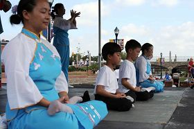 法轮功学员除了入选参加游行之外,还应邀在活动现场摆设展位,向不同族裔民众展示各种语言的《转法轮》,并演示五套法轮功,很多游人纷纷索取法轮功真相资料。中午游人最多的时段,法轮功学员应邀上台展示功法,并表演舞龙、舞狮和腰鼓。