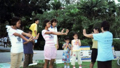 有好多人来学炼功法。有个男士来了两天,当学炼第五套功法时,他说:这功法真神,一上来就定住了。虽然他动作还不准确,但已感觉到法轮功的威力。有个接孩子放学回家的妇女在公园看到学员们,当场跟着学炼,结束后还要用车送学员回旅店,并请了泰文《转法轮》。她双手捧着书激动的说:“我得到宝了。”法轮功学员们为又一个有缘人得法而欣慰。