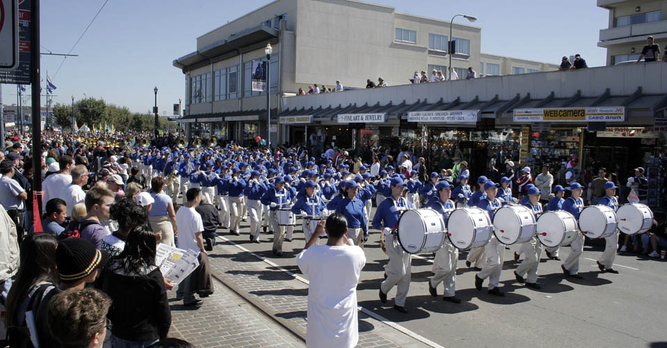 最值得一提的是,在这个盛大的游行中有一支我们中国人的队伍,而且是规模最大的一支:超过300多人的法轮功的队伍。身穿蓝色上衣的军乐队和黄色服饰的炼功队伍,即使灿烂的加州阳光也无法掩住这支队伍所散射出的耀眼的光芒和纯净,不仅是吸引着沿途观众的掌声、镜头和笑容,更让那些来自中国的观光客们情不自禁的发出赞叹。