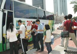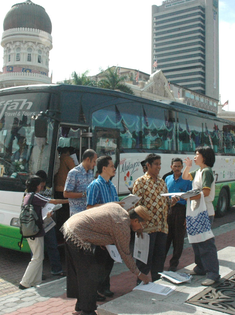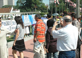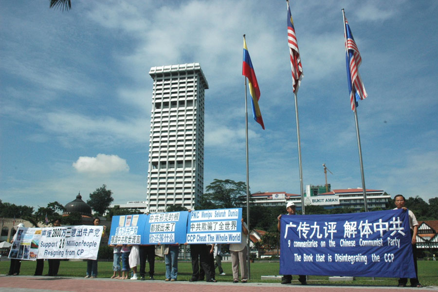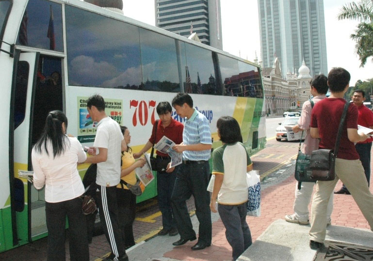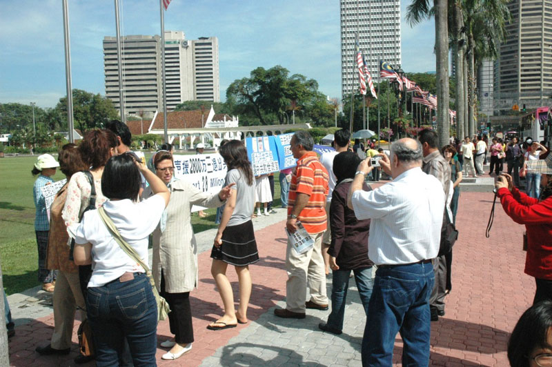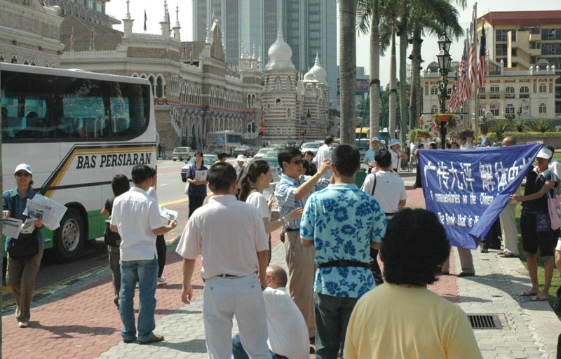此外,义工们也发中文、英文以及马来文的退党简介,《九评》等资料,把退党大潮的最新情况传递给来自世界各地的游客,其中包括中国、香港、印尼、印度、法国等国家的人们。来自中国的游客在上巴士离开前争取时机看展板和资料,以多了解目前在国内发生的退党状况。