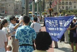 ![]() 义工于独立广场前手举横幅展板,传播三退(退出中共党、团、队)大潮的信息 |