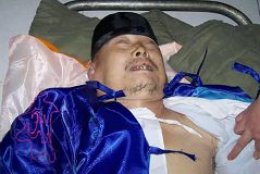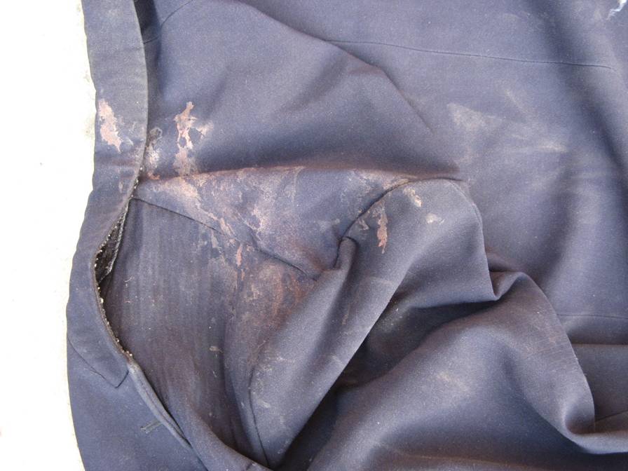 ![]() 亓廷松生前穿的衣服,衣服在被殴打过程中撕裂,殴打造成的内伤使他大量吐血,衣物上仅是沾上的一点点。 |