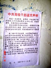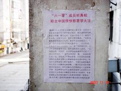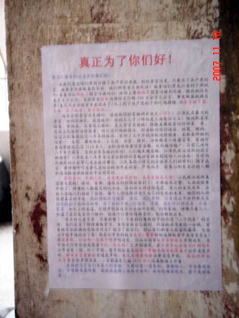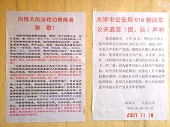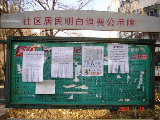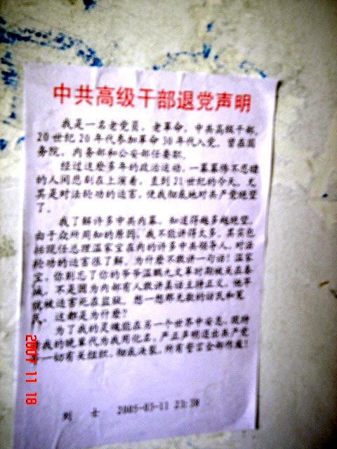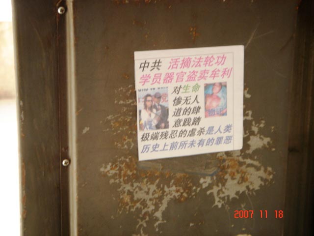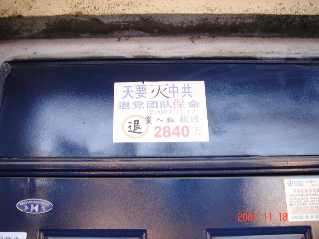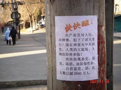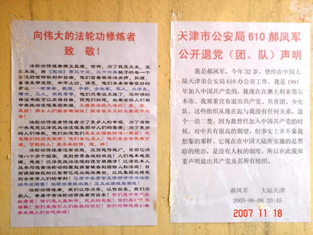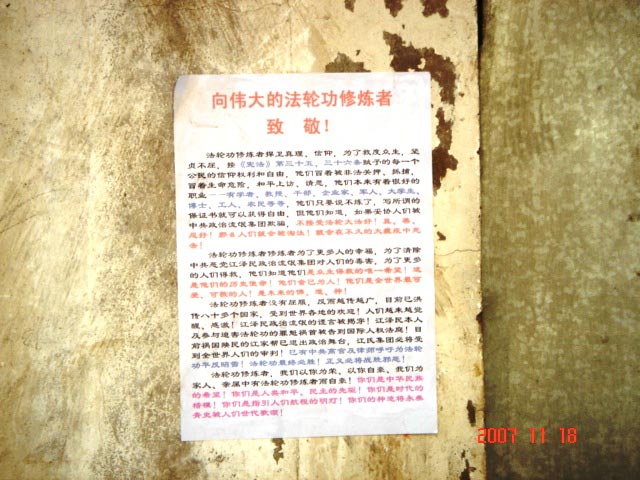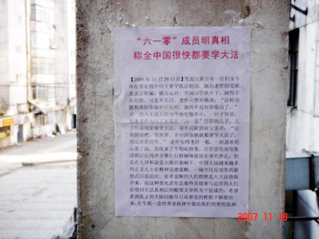 【明慧网二零零七年十一月十九日】二零零七年十一月中旬,在北方某大城市的街道的电线杆上、小区宣传栏上、家属区的墙壁上、防盗门上出现了大量张贴的或用大蜡笔写的真相标语。