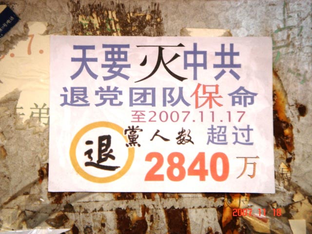 还有:“声援退党、团、队已超2800万人!”、“天要灭中共,退党平安”、“快快醒!天要灭中共,三退保平安!”、“退党保平安”等。