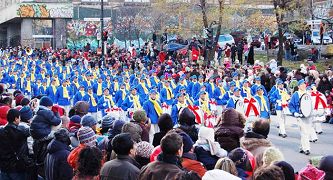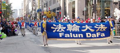 【明慧网二零零七年十一月十九日】(明慧记者肖妍报导)二零零七年十一月十七日,在加拿大蒙特利尔最繁华的圣凯色琳大街上,刚刚成立两个月的蒙特利尔天国乐团身穿着蓝色上衣,在蓝底金字的“法轮大法”横幅引领下,参加了圣诞节游行。超过一百二十人组成的天国乐团,是今天最壮观的游行队伍。