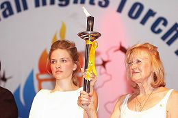 “正义女神”和澳洲人权圣火传递大使简•贝克女士共同高举火炬,宣布跨越维省五十个城镇的圣火传递即将拉开帷幕
