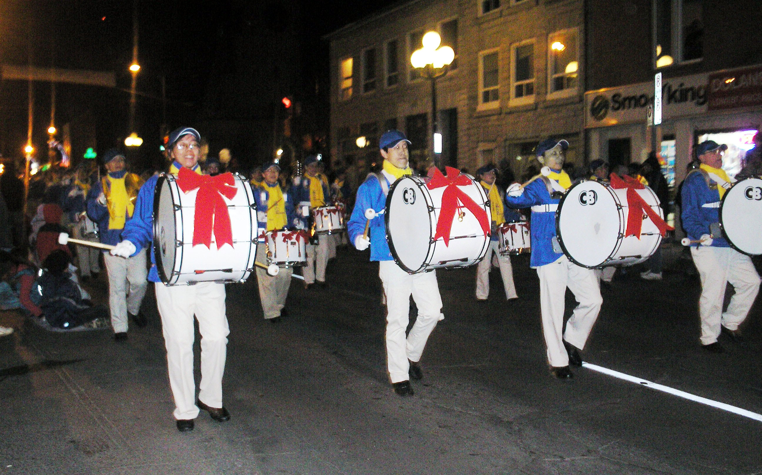 自几年前金斯顿把游行改到晚上举行后,这是法轮功学员第一次参加。十一月的金斯顿已是秋意正浓,天国乐团是最后出场的几个团体之一,但人们却兴致不减,观看到最后。