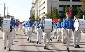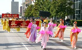 法轮功学员神采奕奕,组成的方阵有“法轮大法”、“真、善、忍”横幅、身着中国特色唐装的表演、法轮功功法的展示,突显东方神韵;天国乐团的精心演奏,将“法轮大法好”、“法鼓法号震十方”等乐曲传送与观众。法轮功学员队伍整齐、以东西方文化交融的风格,清新自然,格外醒目,观众动容,一些观众情不自禁致以欢乐的掌声。