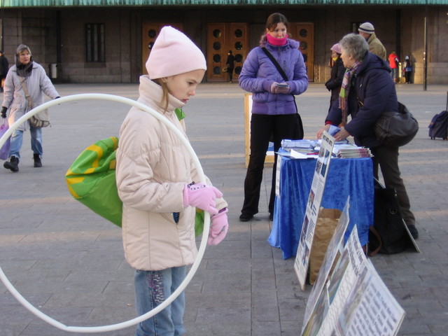 一位芬兰女士告诉Sinikka说,她曾经去过中国,亲眼目睹过中国警察残暴迫害中国人,她感到非常恐怖,以至回来后,没敢告诉任何人,包括她的亲人。今天看到学员在这里揭露中共迫害法轮功的真相,她说:你们做的太好了!