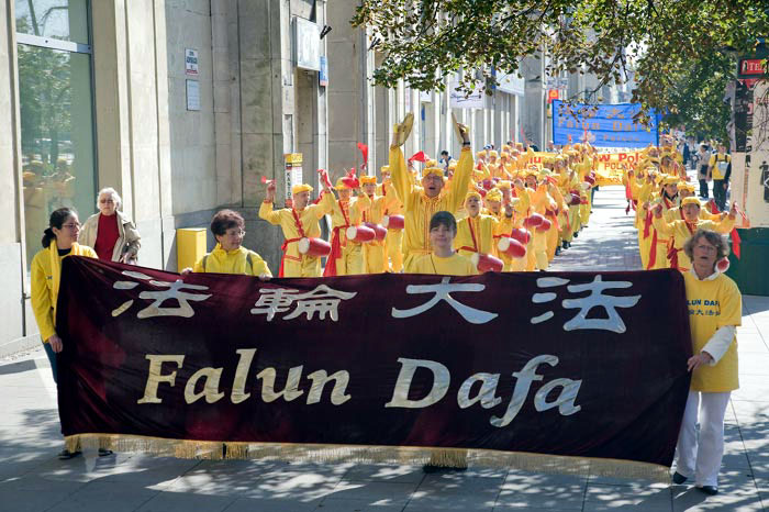 ![]() 波兰文《转法轮》面世,在华沙举行了为期两天的洪法活动,此为腰鼓队表演 |
