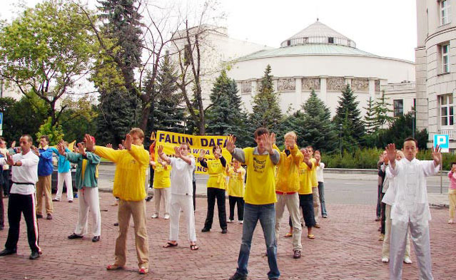 ![]() 在波兰国会大厦前集体炼功 |