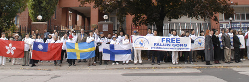 抗议者们站在多伦多中领馆外谴责中共迫害法轮功。