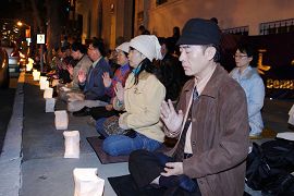 法轮功学员在中领馆前点燃蜡烛,横幅上写着“法轮大法好”、“呼吁制止中共残酷迫害法轮功”等标语。