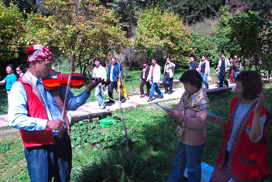 悠扬的琴声又飘扬在云山神木间,这群法轮功学员用音乐传送大法福音,传送真相。