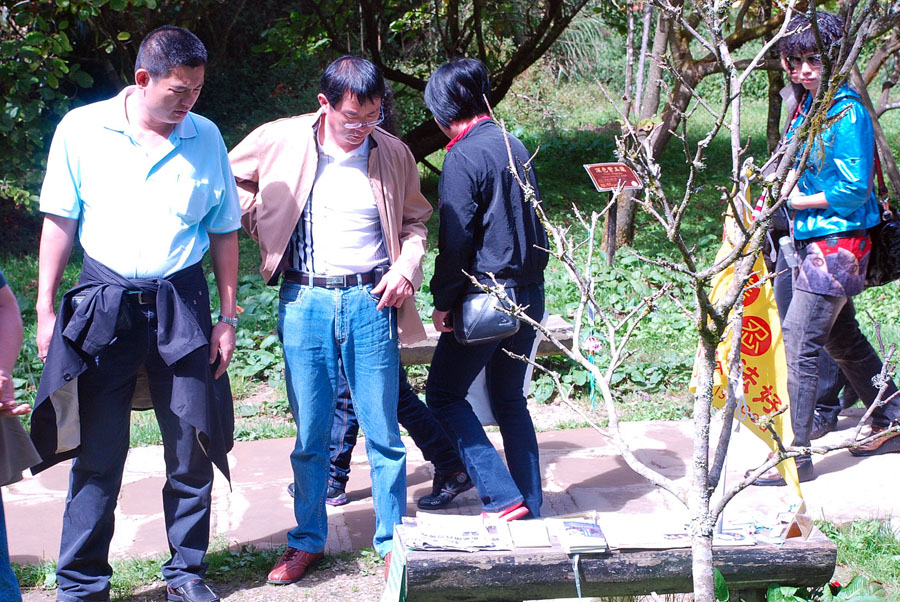 ![]() 由姐妹潭下来的大陆游客大都会停下脚步观看法轮功资料及手写展板内容 |