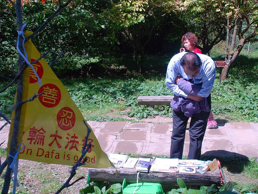 自从海峡两岸开放人民观光以来,中国大陆游客大批拥入台湾各景点,台湾嘉义地区的法轮功学员从那时起,就长期在阿里山洪法讲真相,他们发现从过去中国的游客不敢拿资料,到最近,已经会主动要求了解法轮功的真相。这位学员表示:「有时候我们坐在步道旁的草坪上学法,常常会有中国游客拿着法轮功的材料站着看,也有的拿着法轮大法的书籍《转法轮》问我们说,是不是就是这本书,然后就坐在我们旁边看了起来。」
