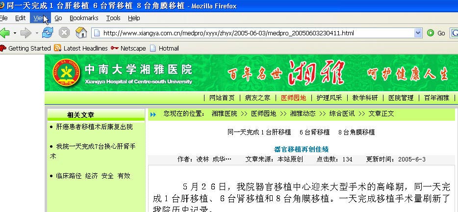 湖南医科大学附一医院创建于1906年11月,当时称“雅礼医院”,1914年更名为湘雅医院。于1992年10月正式恢复“湘雅医院”名称。在本地有湘雅附一、湘雅附二、湘雅附三,而其实“附二”始建于1958年,隶属于国家教育部直管的中南大学;“附三”是由国家卫生部“八五”期间建的,于1992年12月试运行。“附一”才是湘雅医院。湘雅医院的网站就有诸多报道,如2005年9月3日“综合医讯”栏目就《大型器官移植渐成家常便饭》和“同一天完成1台肝移植 6台肾移植 8台角膜移植”的报道(https://www.xiangya.com.cn/medpro/xyyx/zhyx/2005-06-03/medpro_20050603230411.html)。
