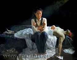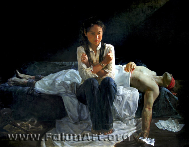 “蒙难在中原”的画作中,年轻的女子坐在床边,双手交叉,紧紧地抓绞着自己臂膀上的衣服。泪珠在微光下闪烁。男子横躺着,头倒坠;一手捂着身体,血从指缝中流出;另一臂直直的垂着,松开的手指中有一张被撕的“洗脑书”。他戴着脚镣,死在囚禁他的地方。画家以蒙住眼睛的红布条代表红色恐怖,暗示中共长期以来对中国人民的精神控制奴役与折磨;同时展现了法轮功修炼者不放弃信仰,为争取人的最基本的权利而献身的无私与无畏。