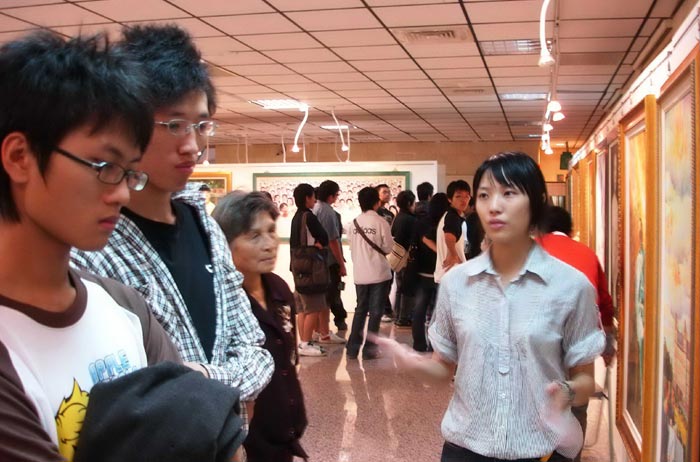 邻近的另一所高雄应用科技大学学生,在得知美展讯息后,利用两天上完学校最后一节课后的傍晚时分,顾不得吃晚餐,四五十名学生,骑着机车,联袂而来,使整个展场气氛顿时热络起来。他们慢慢浏览,细听导览者透过美好的艺术创作细说其中曲折,有关法轮功是什么,为什么在中国大陆遭到残酷打压,却能洪传全世界八十个国家等等。由于每一幅画的背后都有一段动人的故事,导览者引导学生拓展思维空间,关注眼前正在发生的悲壮历史,同时明辨人间是非善恶,惕厉自己坚守正义,长保善念,当下唤起这批大学生的共鸣。他们由原来对法轮功的懵懂印象、漠不关心,到离开展场时有了相当的了解,也明白为什么有越来越多来自国际的声援力量,一名学生忍不住说出心里的想法,觉的自己生活的太安逸、视野太狭窄了,以后他会多去关心世上受苦难的人群,他们说这是课堂内学不到的宝贵一课。
